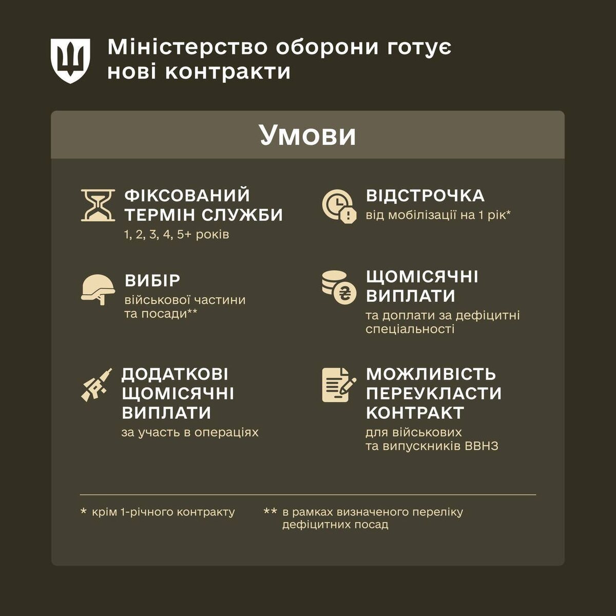 Официально объявлено, что вскоре Украина представит проект контрактов на службу в ВСУ, которые отчасти должны решить два больных для солдат момента: зарплаты и сроки службы. Эта схема введёт аналог подписного бонуса. Пока слухам выплаты таковы: ▪️Контракт 1 год: 50 тысяч сразу и 480 тысяч в течение года; ▪️Контракт 2 года: 100 тысяч сразу и 1,6 миллионов в течение двух лет; ▪️Контракт 3 года: 150 тысяч сразу и 1,75 миллионов в течение трёх лет. Согласно инфографике контракт можно заключить только на «дефицитные» специальности, видимо оформиться в бригаду делопроизводителем и получить свой миллион не выйдет. Система явно ориентирована на то, чтобы основная масса заключала двухлетние контракты, во-первых, выплата гораздо выше, чем за однолетний, во-вторых, и это самое главное: только двухлетний или больше контракт даёт отсрочку от мобилизации на 1 год. Учитывая разрешение на выезд за границу, более двух лет Киев воевать 100% не планирует. Сначала о размере выплат. Они в ВСУ считаются