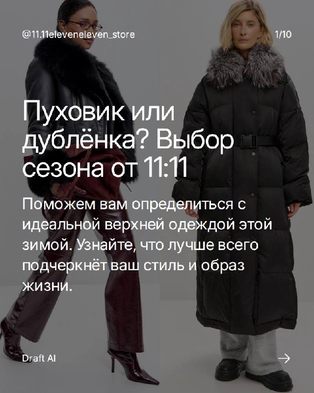 🖤 Пуховик или дублёнка — что выбрать этой зимой? Каждый сезон один и тот же вопрос: хочется быть стильной и при этом не мёрзнуть. Кажется, всегда приходится выбирать между комфортом и красотой… но не в этот раз. ✨ Дублёнка — это про статус, уют и мягкую роскошь. Идеальна для города, вечерних выходов и уверенного образа. Да, требует ухода — но выглядит безупречно. ❄️ Пуховик — лёгкий, практичный, дарит свободу движения. Идеален для активных дней, путешествий, делового ритма. Но иногда хочется чего-то более женственного… 💫 А если не выбирать? В коллекции 11:11 ElevenEleven есть модели, сочетающие тепло пуховика и эстетику дублёнки. Мягкие линии, приглушённые оттенки, тактильный комфорт — всё, чтобы быть собой без компромиссов. А ты что выберешь этой зимой — пуховик или дублёнку? Напиши в комментариях 💬