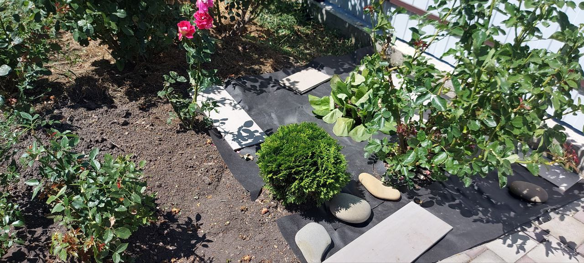 Здравствуйте друзья! Сегодня выдался теплый и безветренный день. Пользуясь таким подарком природы, мы целый день занимались своим садом. Мы ранее решили землю вокруг роз, которые растут у нас перед входом в дом, закрыть черным укрывным материалом, и задекорировать его камнями. Но нам не хватило тогда укрывного материала. Вместе с укрывным материалом, заказали крепления (грибки) материала к земле, чтобы его не поднимало ветром. Сегодня мы возобновили работу и трудились до победного. Всё, что запланировано было раннее, мы наконец закончили. Самое трудное было выполоть всю траву. Для этого пришлось практически всю землю перекапывать заново. Здесь, на юге, очень быстро растет всё, что поливаешь, и трава не исключение. Но сейчас вся земля очищена от сорняков, закрыта укрывным материалом, и только осталось привести камни для декорирования. Просто укрывной материал смотрится не очень хорошо. Всё время, пока трудились, смотрели на розу «Аспирин», которая цветёт не переставая всю осень. Конеч