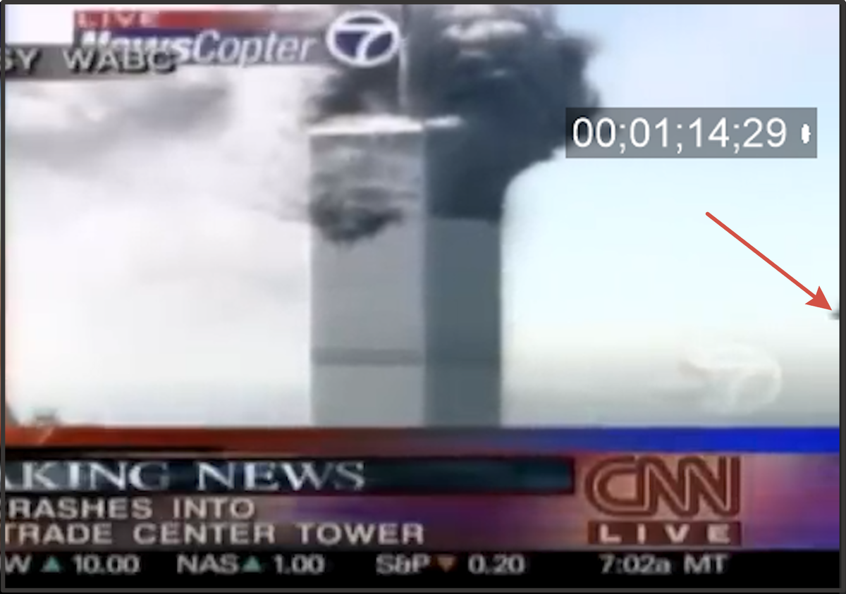 Официальная точка зрения - самолет летел со скоростью примерно 930 километров в час. "Самолёт, врезавшийся в Южную башню Всемирного торгового центра (ВТЦ) 11 сентября 2001 года, — это рейс United Airlines 175. Согласно данным Национального совета по безопасности на транспорте США (NTSB) и анализа видеозаписей, его скорость в момент столкновения составляла примерно 586 миль в час (около 943 км/ч)." Но с этим мнением большинство конспирологов не согласны. Вот одно из мнений (Фредди Крюгер) Специалисты определили скорость самолета по многим показателям: Но это все "официальные" данные и измерения. А мы возьмем и проверим! Для этого мы воспользуемся телевизионной трансляцией в прямом эфире. Попадание самолета в Южную башню произошла после попадания в Северную. Башня после попадания в Северную башню горела, и ее уже снимали многочисленные камеры. Поэтому последний этап полета самолета и попадания его в Южную башню засняли многие камеры. Вот одна из них: Мы знаем, что: Следовательно, нам