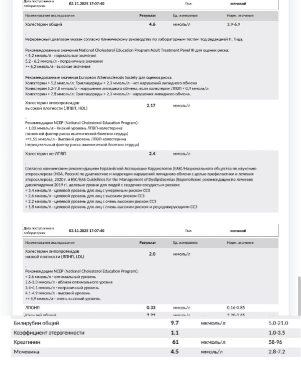 Готовы мои анализы. Выкладываю показатели холестерина после 4 лет на кето-лайт. Самый главный показатель здесь - риск атерогенности, у меня он 1,1 - очень низкий.
