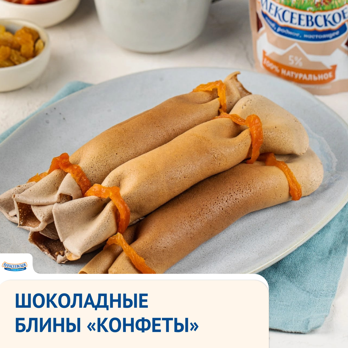 Ни дня без блина — особенно, когда он сладкий и праздничный! Эти шоколадные блины с творожно-фруктовой начинкой выглядят, как настоящие конфеты — мягкие, ароматные и просто тают во рту. Ингредиенты: • Яйца — 2 шт. • Молоко — 1 ст. • Сахар — 1 ст. л. • Сгущённое молоко с какао «Алексеевское» — 2 ст. л. • Мука — 120 г • Разрыхлитель — ½ ч. л. • Щепотка соли • Растительное масло — 2 ст. л. Для начинки: • Творог — 350 г • Курага — 50 г • Изюм — 50 г • Сахар — 2 ст. л. • Сметана — 2 ст. л. • Ванилин — по вкусу Блины получаются шоколадные, нежные и очень нарядные. Заверните их с начинкой в виде конфет, украсьте сахарной пудрой — и получите десерт, который невозможно не полюбить. С «Алексеевским» каждый день — вкусный повод для улыбки! #Алексеевское