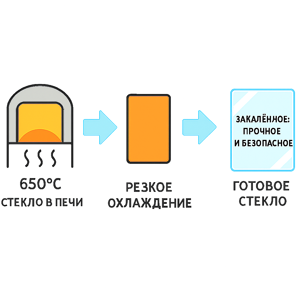 Вы видите, как разбивается автомобильное стекло или дверца душевой кабины — и вместо опасных осколков с острыми краями остаётся миллион мелких кубиков, похожих на сахар. Почему оно не трескается, как обычное окно, а «взрывается» целиком? Всё дело в напряжениях, заложенных в стекло ещё на заводе. Закалённое стекло делают так: обычное листовое стекло нагревают до 600–700°C, а потом резко охлаждают струями холодного воздуха. Поверхность остывает мгновенно и «застывает», а внутренние слои — медленнее. Когда они наконец сжимаются, они натягивают уже застывшую поверхность, как струну. В результате: