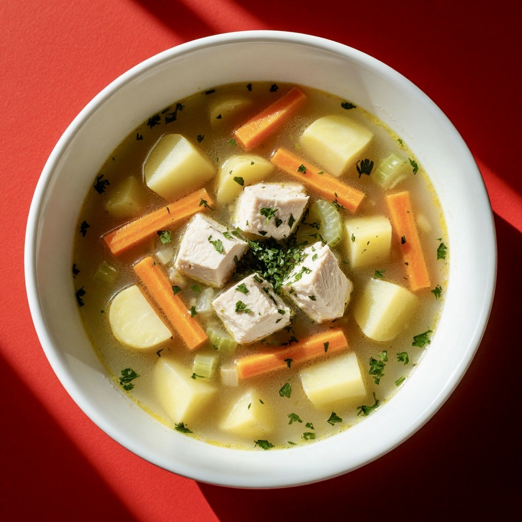 «Главный секрет этого супа — в медленном варке бульона. Не допускайте бурного кипения: так бульон останется прозрачным, а курица — сочной. Обязательно снимайте пену в начале варки. Для более насыщенного вкуса можно добавить в бульон половинку очищенной луковицы и морковь целиком — потом их легко удалить. Если хотите сделать суп ещё легче, замените картофель на кабачок или цветную капусту. И помните: зелень кладите в самом конце, чтобы сохранить максимум витаминов и яркий цвет».