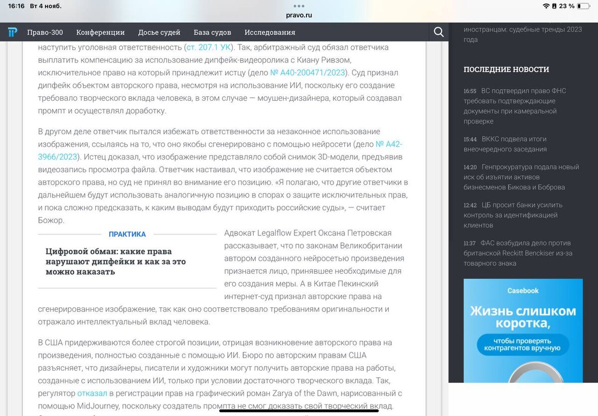 Дала комментарий Право.ру о судебных прецедентах, связанных с использованием технологий искусственного интеллекта .