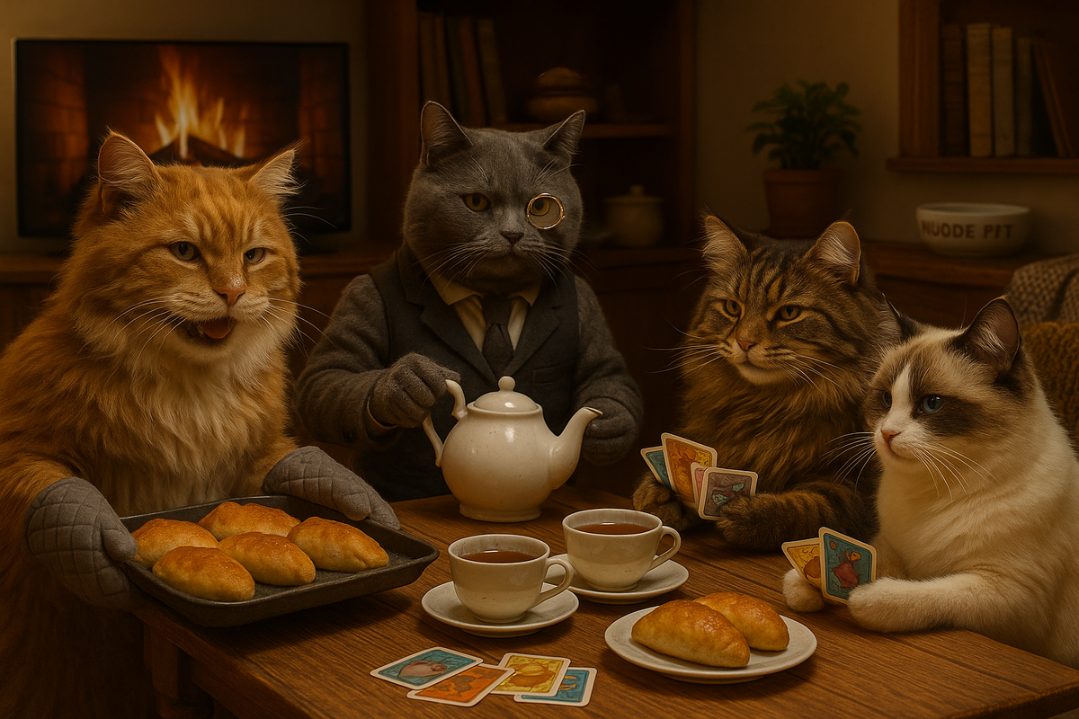 Пирожки с тунцом и каплей сливочного масла. Тесто под лапами мягкое, как Нюшин коврик, запах рыбы витает по всему дому — даже Петрович перестал фыркать. Василий Петрович, между тем, заваривал чай — строго по инструкции, конечно.