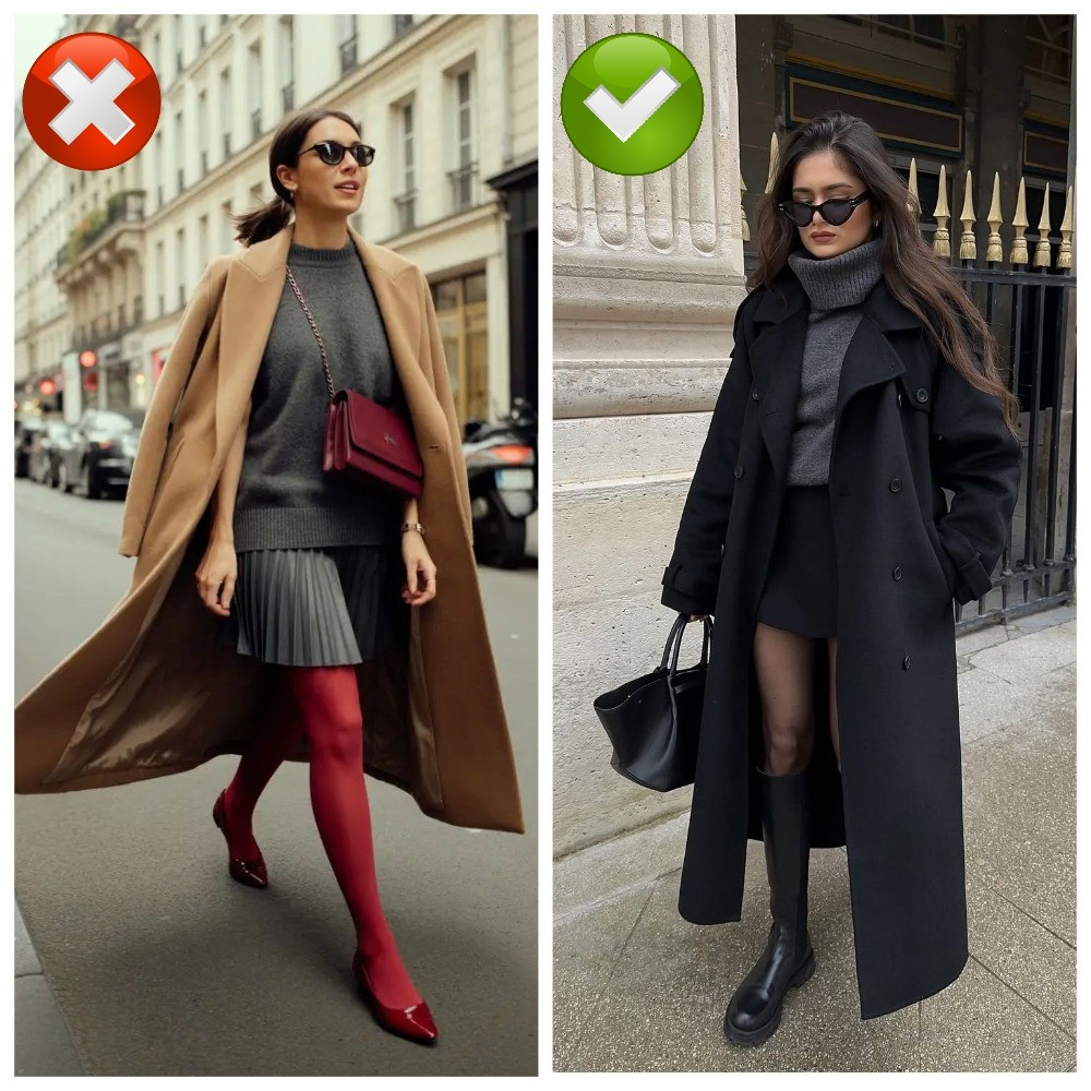 Конечно, есть вещи, которые смотрятся элегантно и роскошно, но если задать для них неправильный фон, они просто потеряются и станут безликими. Например, если лаконичное пальто из шерсти надеть вместе с блестящими или цветными колготками , это будет провал.