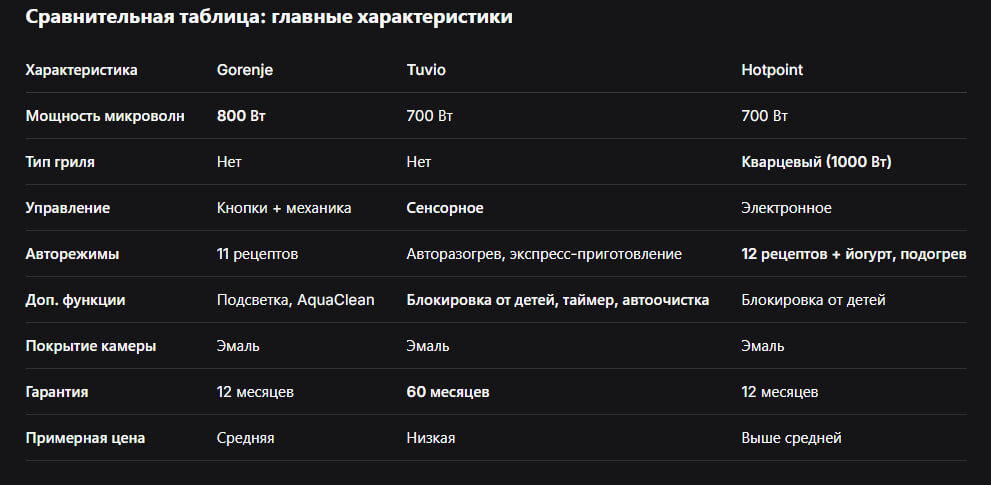Я взял три интересные модели от разных брендов — Gorenje, Tuvio и Hotpoint — с одинаковым объемом в 20 литров, но с совершенно разным набором функций. Давайте посмотрим, чем они отличаются и кому какая подойдет идеально.