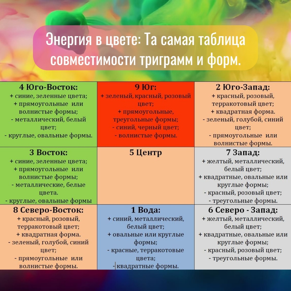 Забудь о скучных правилах! Фэн-шуй — это веселая игра в «собери команду мечты». Каждый цвет — это игрок с особыми способностями: Вода (синий, черный) — капитан команды, отвечает за мудрость и карьерный рост. Дерево (зеленый) — мотиватор, заряжает творчеством и ростом. Огонь (красный