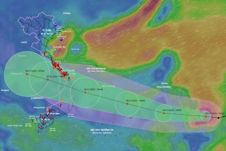 Тайфун Калмаэги ( 13 тайфун в этом году)может обрушиться на побережье от Дананга до Кханьхоа утром 7 ноября. Ветер и волны до 10 метров угрожают архипелагу Чыонгша.
