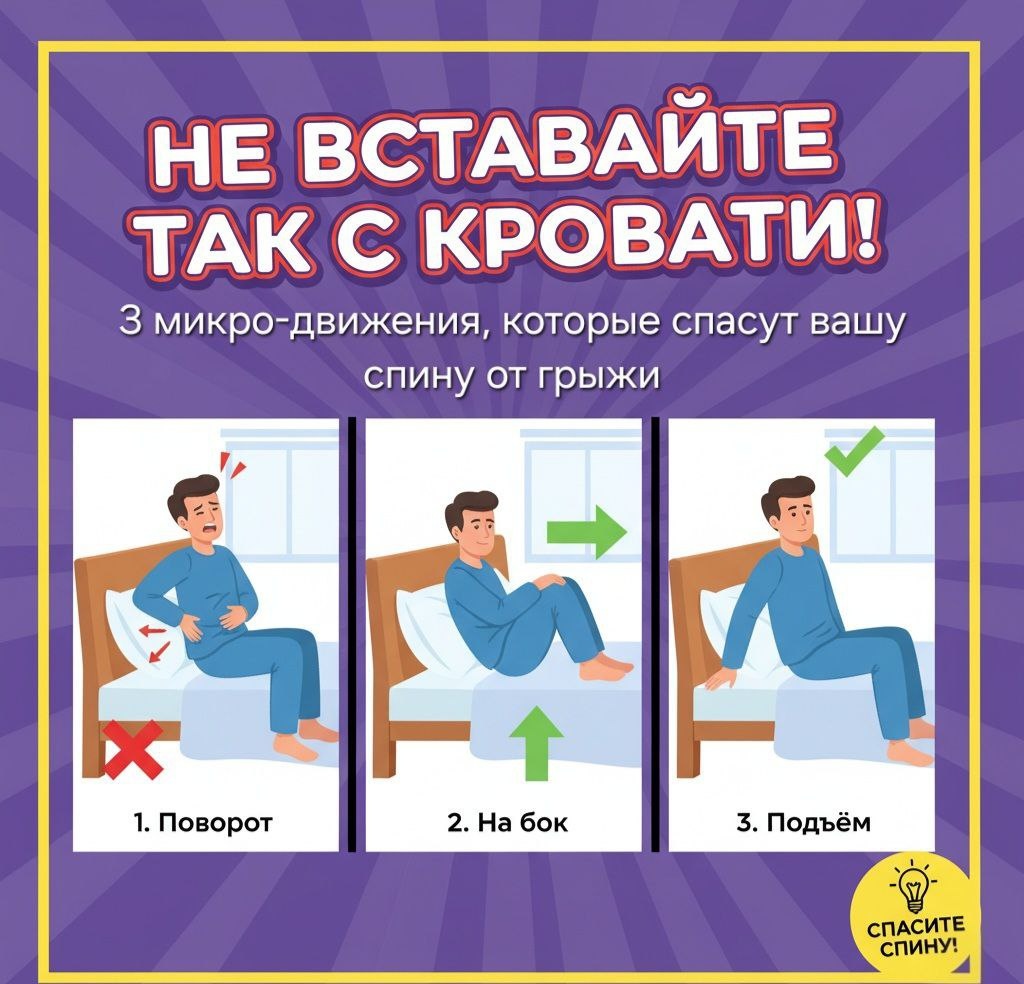 ДЗЗЗЗЗ! Будильник. Ваша первая мысль — выключить его. Ваше первое движение — резкий подъем с кровати, скручиваясь и садясь. Стоп. Прямо здесь, в первые десять секунд дня, вы совершаете главную ошибку, которая медленно, но верно убивает ваш позвоночник. Вы не просто проснулись. Вы проснулись после 8 часов горизонтального положения. Важно помнить, утром ваша спина невероятно уязвима. Ночью ваши межпозвонковые диски, как губки, впитывают жидкость и "набухают". Они становятся выше, но при этом менее устойчивыми. Мышцы вокруг позвоночника "холодные" и расслабленные. И когда вы делаете резкий «скручивающий» подъем, вы даете концентрированную, неравномерную нагрузку на эти уязвимые диски. Это прямой путь к "прострелу", смещению и, в конечном итоге, к грыже. Хорошая новость: чтобы спасти спину, нужно потратить всего 30 секунд. До того, как ваши ноги коснутся пола. Первое: «Внутренний Корсет» Прежде чем сделать хоть одно движение, вам нужно «включить» мышцы, которые держат ваш позвоночник. Мы г