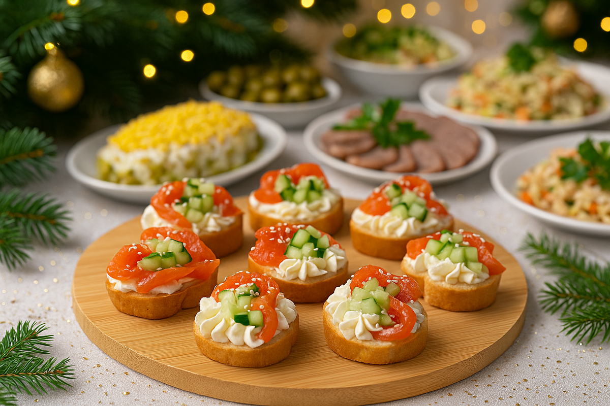 Каждый год мы стараемся сделать новогодний стол не просто вкусным, но и красивым. Хочется, чтобы блюда не только радовали вкус, но и создавали настроение праздника. Сегодня я поделюсь рецептом, который точно станет украшением вашего стола — праздничные брускетты с красной рыбой и творожным сыром. Готовятся они за считанные минуты, а выглядят — как закуска из ресторана. Хрустящий багет, нежный сливочный крем и малосольная рыба — сочетание, которое невозможно испортить. Брускетты — это итальянская закуска, где основа — хрустящий хлеб, обычно багет, а сверху — аппетитная начинка. В нашем случае мы используем привычные и любимые продукты, но подаём их в красивой праздничной форме. Эта закуска идеально подходит для новогоднего вечера: Чтобы приготовить такие брускетты, вам понадобится: Продукты самые простые, но в сочетании создают праздничную гармонию вкусов и текстур. Такие брускетты можно разложить на большой тарелке или деревянной доске, украсить веточками розмарина, гранатовыми зёрн