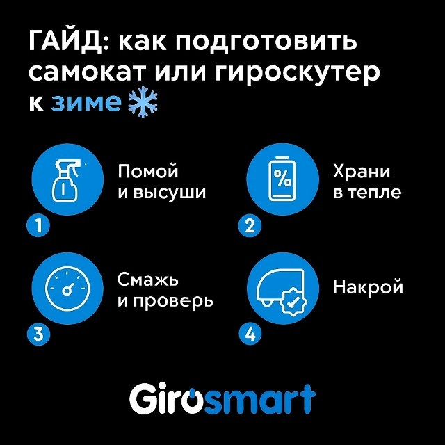 Сезон подходит к концу, и самое время позаботиться о своём транспорте. Чтобы весной ваш самокат (или гироскутер) завёлся с пол-оборота и не подвёл - вот короткий чек-лист от GIROSMART 👇 1. Очистите технику