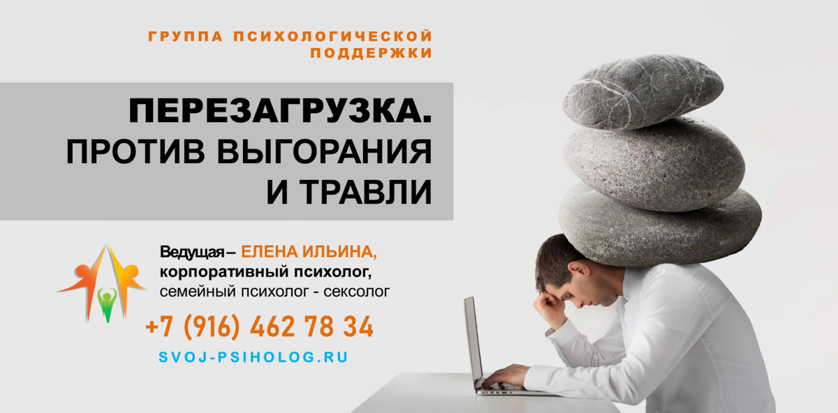 Источник: Психологический центр СВОЙ ПСИХОЛОГ, Групповая психотерапия в Москве, Группа психологической поддержки "Перезагрузка. Против выгорания и травли (буллинг, моббинг)"