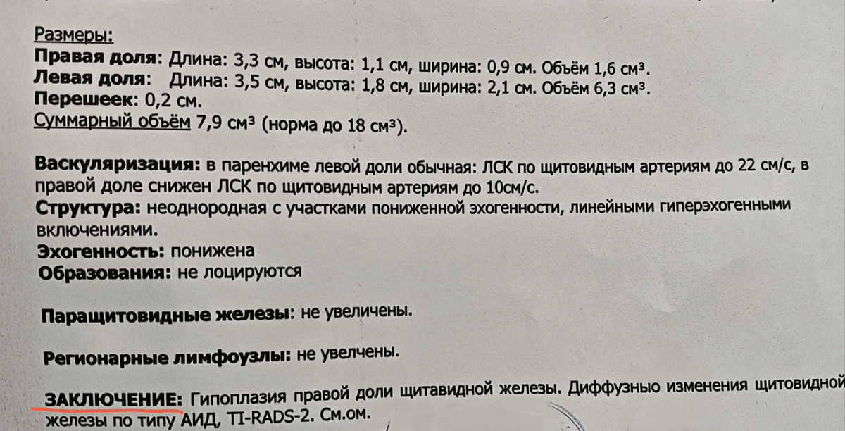 На прошлой неделе наконец-то посетила энд0кринолога. Давно собиралась. Оказалось, что в том мед центре, где врач принимала нагло врали, что она в отпуске. Спустя пару месяцев я поняла, что что-то не то и стала искать где этот специалист ещё работает. Она принимает в одной клинике от местного завода, но туда простым смертным не попасть. И вот, наконец то я нашла, что врач появилась в одном платном центре. И даже за деньги удалось записаться только на конец месяца. То есть запись надо ловить где-то за месяц. Это при том, что приём стоит 2200 рублей. Но я хотела попасть именно к ней. Так как наблюдаюсь именно у этого специалиста уже несколько лет. Накануне распечатала необходимый @нализ кр0ви и сделала YЗИ щит@видной железы. Давно наблюдаюсь с АИТом. После луч.евой терапии на грудь щит0видка сильно уменьшилась. Спустя два года после 0блучения описание обследования такое: Правая доля ЩЖ после лучей в 5 раз меньше левой. В заключении смутил диагноз АИД. Вообще он звучит как Аут0им