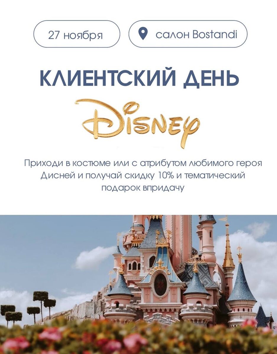 Такое нельзя попустить! 👑 Тематический День Клиента в стиле Disney пройдет в нашем салоне уже 27 ноября! Приходи в костюме или с атрибутом любимого героя Дисней и получай скидку 10% и тематический подарок впридачу. Мы будем очень ждать вас в этот день в нашем сказочном пространстве 🎟️ P.S. мы рекомендуем уже сейчас заранее бронировать самое удобное для вас время 🔗 Записаться