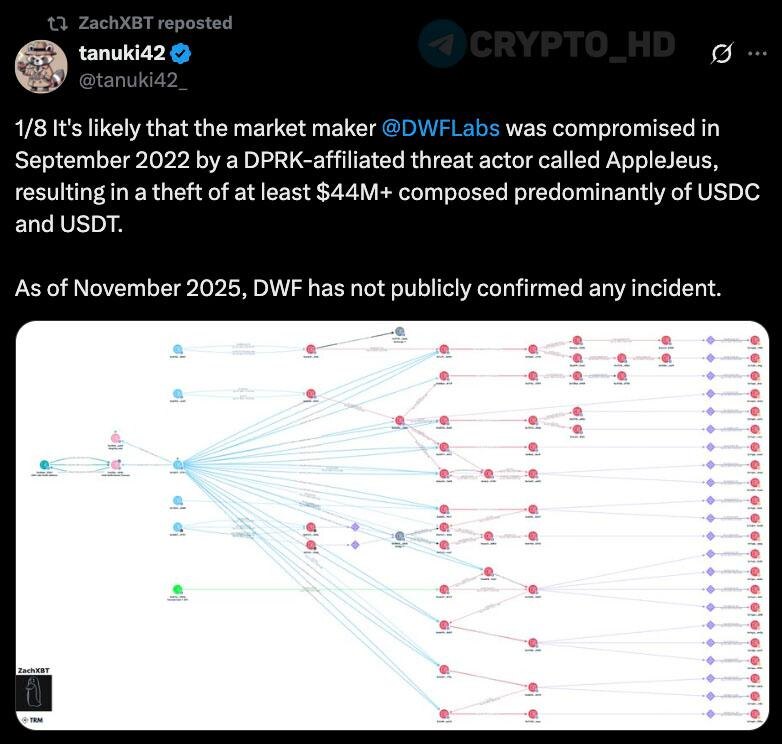#взлом 😐 Маркетмейкер DWF Labs скрыл взлом на $44,000,000 – ZachXBT/tanuki42 В сентябре 2022 года хакерская группировка AppleJeus, связанная с Северной Кореей, украла у DWF Labs активы на $44m – в основном #USDC и #USDT. Маркетмейкер никогда публично не комментировал этот инцидент. Crypto Headlines