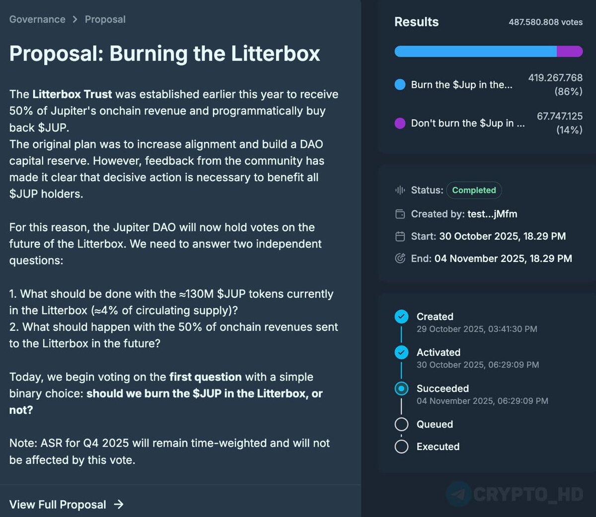 π₯ #JUP Π Jupiter DAO ΠΎΠ΄ΠΎΠ±ΡΠΈΠ»ΠΈ ΠΏΡΠ΅Π΄Π»ΠΎΠΆΠ΅Π½ΠΈΠ΅ ΠΎ ΡΠΆΠΈΠ³Π°Π½ΠΈΠΈ ΠΎΠΊΠΎΠ»ΠΎ 130,000,000 JUP ($44m), Ρ ΡΠ°Π½ΡΡΠΈΡ ΡΡ Π² Litterbox Trust