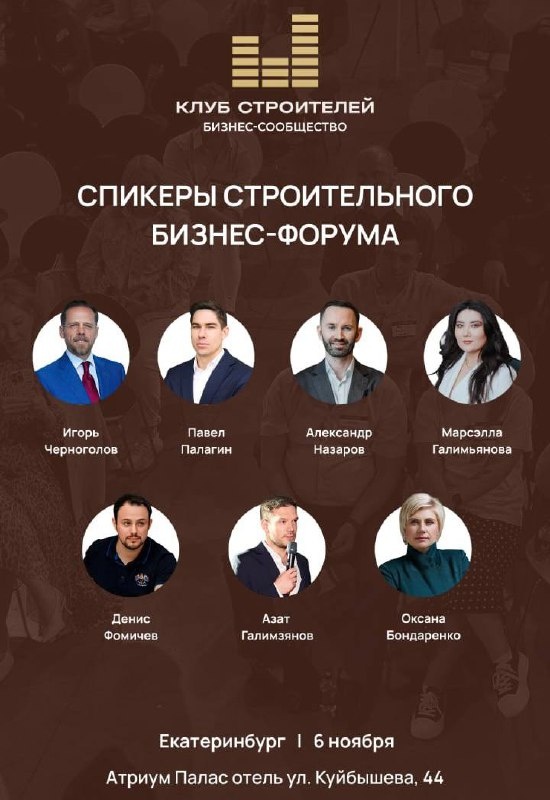 🚀 Впервые бизнес-форум в Екатеринбурге от Клуба Строителей ✨ 6 ноября в столице Урала состоится форум, который объединит профессионалов строительной сферы разных уровней — от начинающих предпринимателей до крупных игроков рынка недвижимости и топ-менеджмента крупных корпораций. Чат форума: https://t.me/+Bjz4ZbIuzMNhZDA6 🏙 Программа форума: 17:00 - 17:30 – сбор гостей и участников, фуршет 17:30 - 17:50 – Проекты, меняющие пространства Спикер: Игорь Черноголов, президент ГК «Пенетрон-Россия», основателя туристического проекта «Мариинские избы» 17:50 - 18:25 – Азат Галимзянов, основатель Клуба Строителей, основатель крупнейшей в нашей стране группы компаний по ремонту и дизайну, спикер ТВ и радио, инвестор, ментор по масштабированию строительного бизнеса 18:25 - 18:55 – Пленарная сессия 19:00 - 19:20 – Нейроэффективность для предпринимателей: 12 безбюджетных способов вырасти в доходе и жизненной энергии Спикер: Павел Палагин, основатель международного сообщества Neuromen, экспе