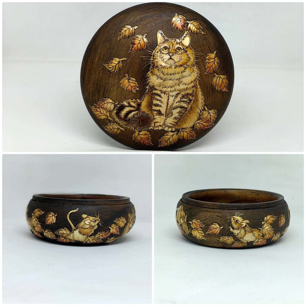 Все началось несколько лет назад, когда я украсила салфетницу мечтающим о чем-то своем котом. Салфетницу эту давно выкупили, а фото увидела одна моя хорошая знакомая. И попросила сделать похожего кота на шкатулке Шкатулку мы подобрали быстро - небольшую, из грецкого ореха. Правда пришлось немного затемнить слишком светлое дерево. Цвет получился очень красивый - кофейно-шоколадный А затем работу над котом пришлось отложить аж на целых пять месяцев. У меня началась непрерывная череда срочных заказов, потом, опять же срочная, подготовка к выставке, затем снова пошли заказы, все с жесткой привязкой к определенным датам. И вот наконец я вернулась к коту-мечтателю)) Я немного доработала пушистого - первый мне нравился не очень. И увеличила его размеры, чтобы подходил для шкатулки А снизу по боку шкатулки решено было пустить мышей. Всего я нарисовала шесть разных мышек, шуршащих среди листвы. Поначалу хотела сделать их совсем маленькими. Но более крупные мыши смотрелись более декоративно, да