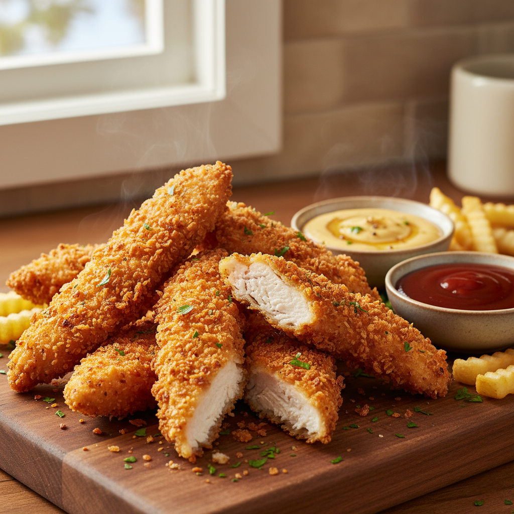 Эти домашние куриные стрипсы — идеальное сочетание сочной куриной грудки и невероятно хрустящей золотистой корочки. Благодаря маринаду на основе пахты мясо получается нежным, как пух, а двойная панировка из сухарей Панко гарантирует тот самый потрясающий хруст, о котором вы мечтали. Идеальная закуска для вечеринки, просмотра кино или просто вкусного ужина!
