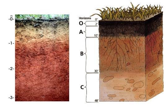 Чтобы понять, что происходит с почвой, не нужно сдавать ее в лабораторию. Достаточно посмотреть на ее морфологию — то есть на ее внешний вид и структуру. Морфологические признаки — это природные индикаторы экологического состояния почвы. 1. Как устроен почвенный профиль (слои) Если сделать вертикальный разрез почвы (как будто разрезать слоеный пирог), вы увидите почвенный профиль — последовательность слоев, или генетических горизонтов,. Каждый горизонт (слой) отличается от другого по цвету, составу и свойствам. Обычно выделяют: • Aо (Лесная подстилка/Дернина): Самый верхний слой, состоящий из опада или густо пронизанный корнями. • А (Гумусовый горизонт): Тёмный, плодородный слой, где накапливается гумус и элементы питания. • А2 (Элювиальный горизонт): Слой вымывания. Он всегда светлого цвета. Из него атмосферные осадки выносят вещества в нижние слои. В подзолистых почвах называется подзолистым горизонтом. • В (Иллювиальный горизонт): Слой вмывания/накопления. Сюда приносятся и задержив