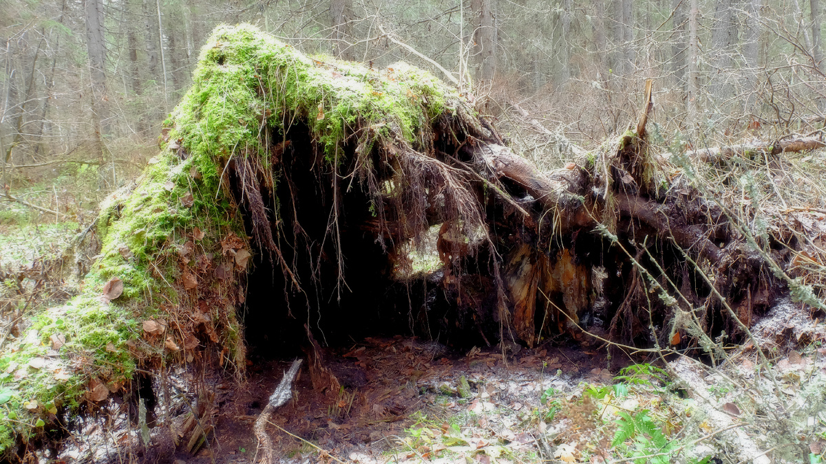 Этим ноябрьским утром мне не спалось. На часах без четверти четыре. Несколько минут поворочавшись в постели - решил вставать. Протопив печи, вдоволь напившись чаю, выхожу на веранду. Термометр показывает минус восемь градусов. Для первых чисел ноября – это нормально. Где то далеко на востоке брезжит рассвет. Иду в гараж и запускаю мотор своего «китайца». Пока машина прогревается - возвращаюсь в дом. Делаю пару бутербродов, наливаю в термос чай, и беру своего верного спутника фотокамеру Nikon. Погода сегодня располагает к путешествию. В машине тепло и уютно. Звучит красивая музыка. Притормозив перед очередным перекрёстком ловлю себя на мысли, что еду, без запланированного маршрута. Я люблю прогулки по нашим северным, глухим, таёжным местам. Свернув с дороги и проехав ещё пару километров - упираюсь в бурелом, и поваленные ветром деревья. Выхожу из машины и двигаюсь по едва заметной тропе. Уже расцвело, а под ногами хрустит первый снежок. Воздух кристально чистый и пахнет елов