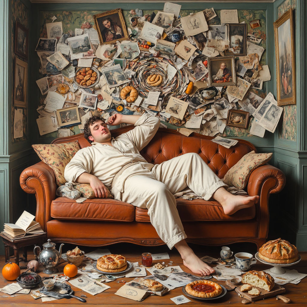 Знакомый образ: человек на диване, окруженный несбыточными мечтами.