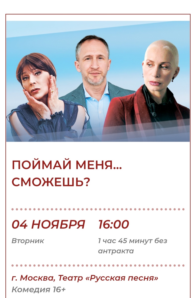 Ни одного моего выходного дня не проходит без встречи с театром "Миллениум" Марафон весёлых, лёгких комедий продолжается теперь и в театре "Русская песня", который сможет вместить всех желающих лицезреть любимых актёров в новых образах.