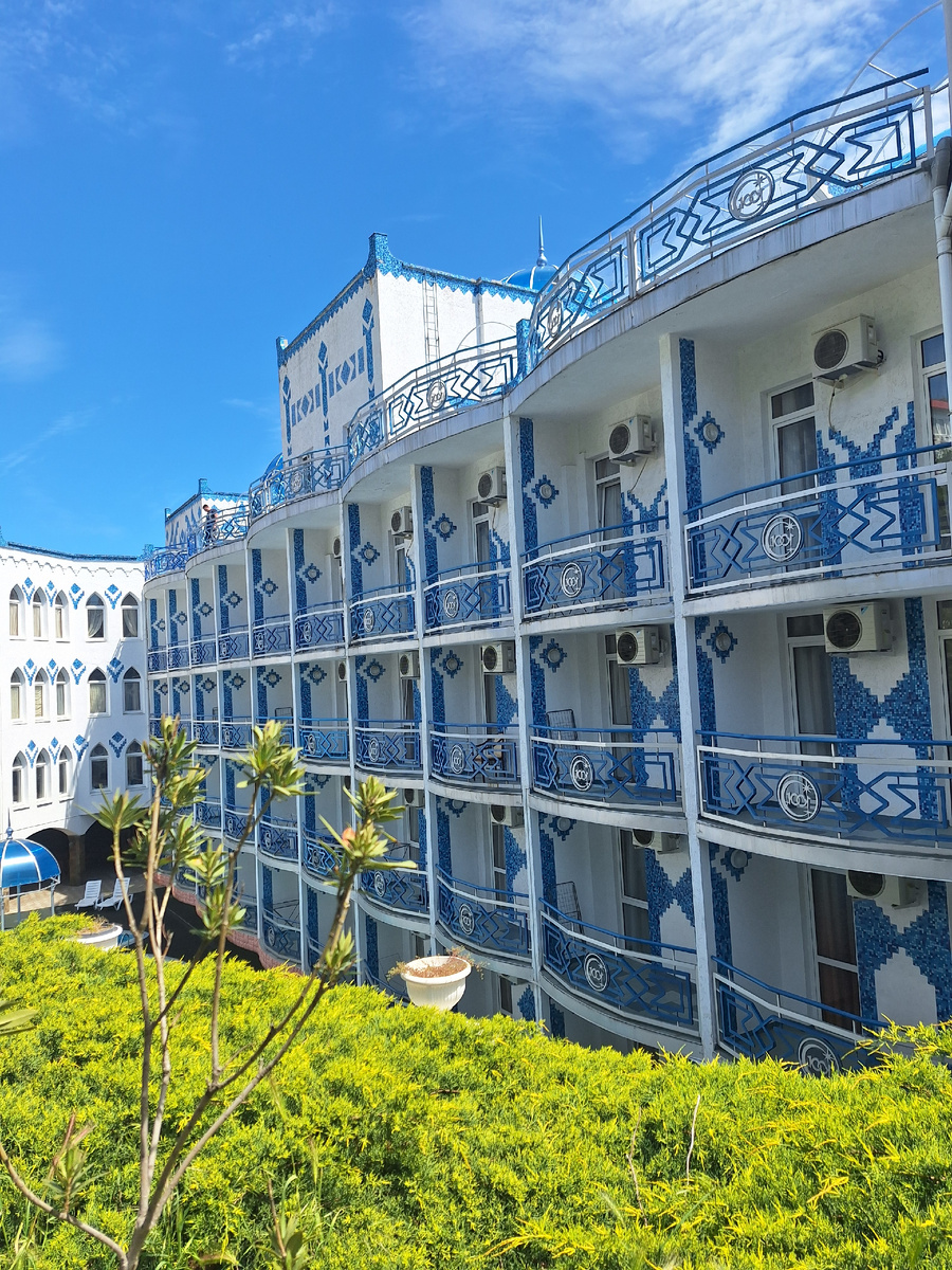 Мы стали спускаться к набережной. Наш путь проходил мимо сказочного белоснежного отеля, украшенного голубым орнаментом.