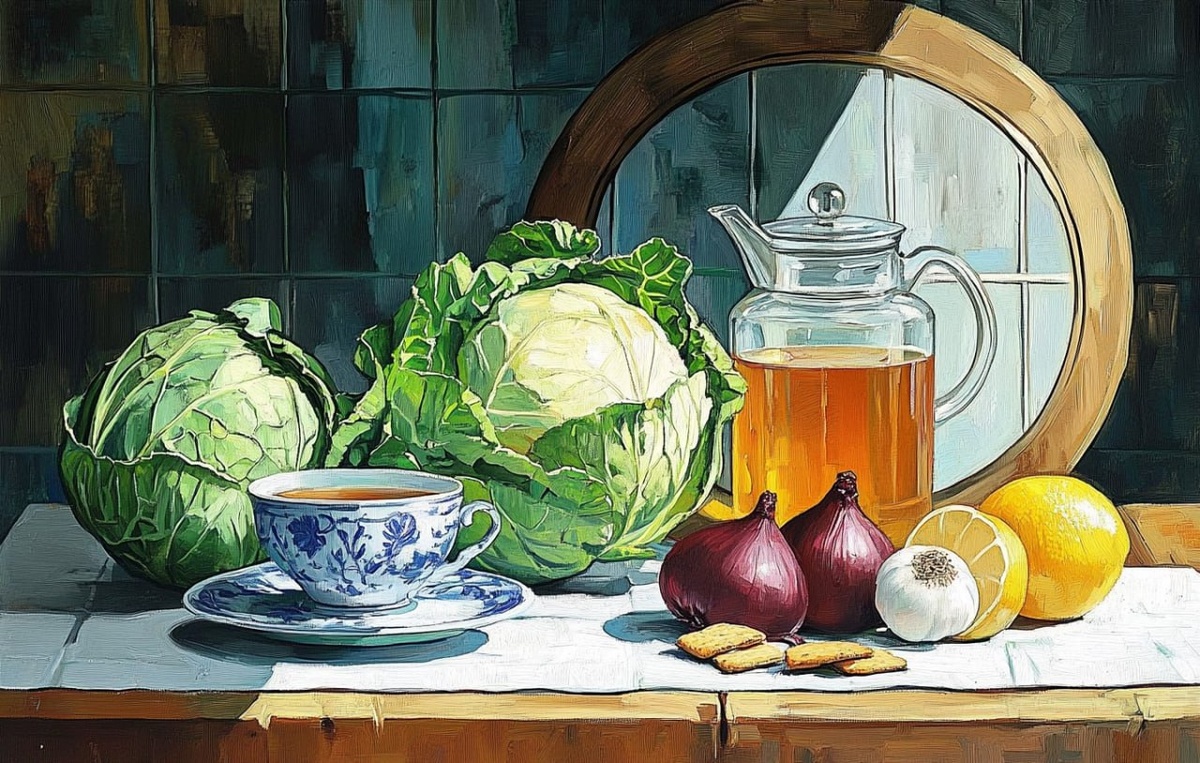 А на столе у меня в эту неделю в основном капуста белокочанная: скромная королева здоровья. Родина: Средиземноморье. Польза: Богата витамином С и клетчаткой. Низкокалорийна, способствует сытости и пищеварению. Содержит уникальные антиоксиданты, снижающие риск хронических заболеваний. КБЖУ на 100 г (свежая): ~28 ккал | Б: 1.3 г | Ж: 0.1 г | У: 6 г Два простых блюда: Салат "Витаминный". Тонко нашинковать капусту, посолить, слегка помять руками. Добавить тёртую морковь, зелень, заправить маслом и лимонным соком. Тушёная капуста. Обжарить лук с морковью, добавить нашинкованную капусту, тушить под крышкой с небольшим количеством воды и томатной пасты до мягкости. #ai #midjourney #диетавкартинках #тарелочки #rusolga подписывайтесь