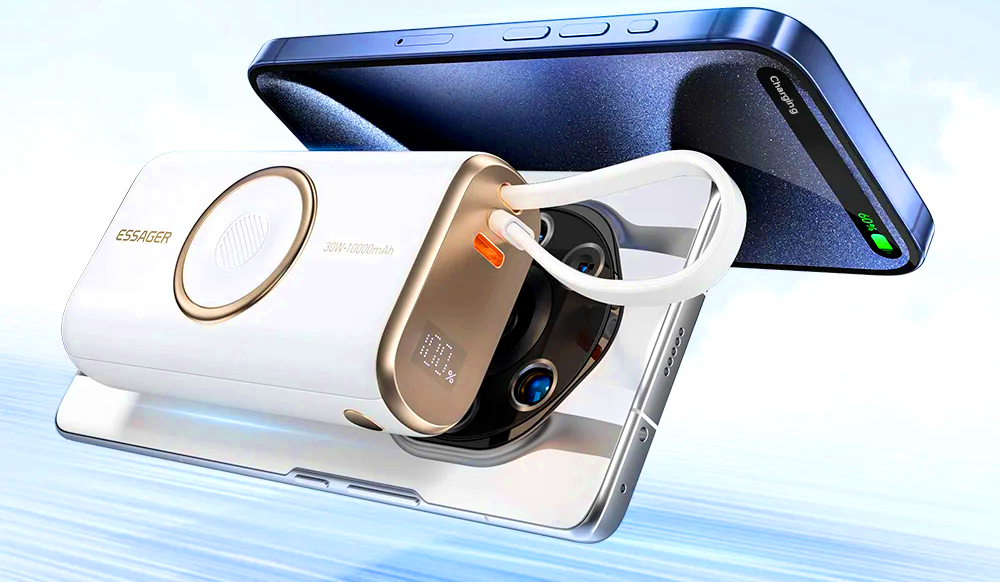 Поддержка быстрой зарядки PD20W означает, что флагманский телефон заряжается с 0 до 50% примерно за полчаса. Встроенные кабели для Lightning и USB-C избавляют от лишних проводов в сумке. Небольшой LED-дисплей показывает оставшийся процент заряда четырьмя делениями, что помогает планировать подзарядку.