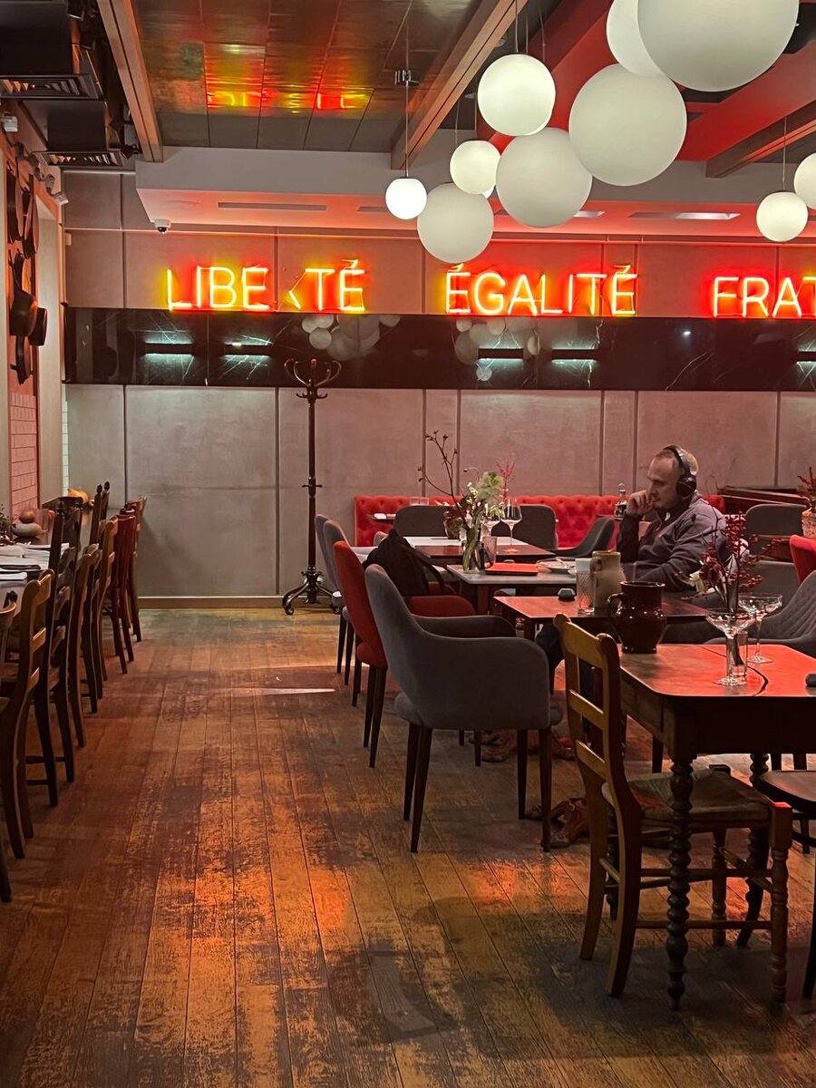 Тот редкий случай, когда ресторан не пытается впечатлить, и именно этим и подкупает. Ресторан Le Moujik находится в пешей доступности от Невского проспекта, ближайшее метро — Владимирская / Достоевская, идти буквально 7-10 минут. В самом названии волшебным образом сочетаются французская изысканность и крестьянская простота. Как основателям удалось добиться такого сочетания? Здесь всегда радушные официанты и хостес. На входе встречают улыбкой, провожают до стола, не оставляют без внимания и подают блюда космически быстро. Вы попадаете НЕ в помпезный шикарный французский ресторан с высокой кухней, а в местечко, где столуются французские простолюдины, но как же вкусно столуются! Залюбуешься. На стенах чего только не навешано: музыкальные инструменты, посуда, сковороды. Как будто полный винегрет, но все вместе выглядит органично и уютно. И, конечно, неоновые слова, которые прочно ассоциируются с французской революцией: Egalité, Fraternité, Liberté добавляют характерной атмосферы. Стулья