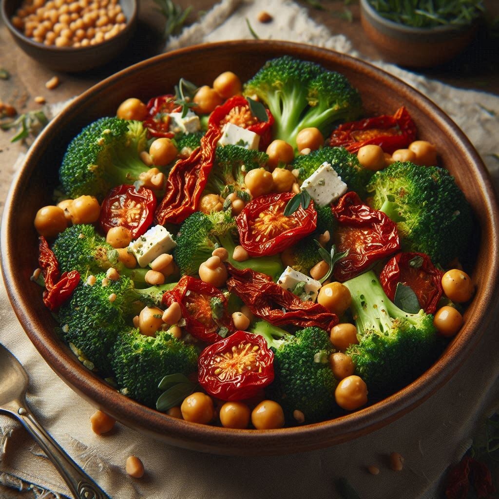 1. Теплый салат с обжаренной брокколи, нутом и вялеными томатами 🥦