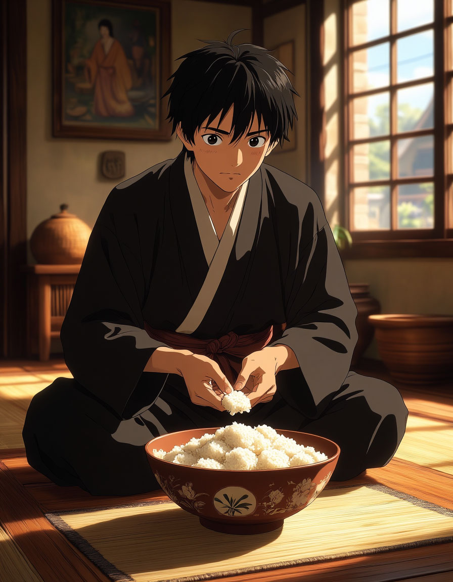 *из рассказов местных жителей. Подборка и перевод - мой. Жил-был зять, парень простоватый. Позвали его как-то на осенний праздник в дом к тестю. В избе суетились женщины, готовя угощение, и приговаривали: «Вот ведь страшилище, а не еда!» Зять, дремавший в соседней горнице, уловил частично эти слова и замер от ужаса. Когда обряды завершились, гостей начали угощать. Кто-то из родни обернулся к нему: «Ну-ка, зятёк, отведай нашего моти!» И вот перед ним поставили миску с тем самым «страшилищем». Парень, помня услышанное, сделал вид, что ест, а сам быстренько спрятал все рисовые пирожки под циновку на полу. Наутро молодой человек проснулся от голода и тут же засобирался домой. Тесть упрашивал его остаться, но зять был непреклонен. Удивлённый старик, махнув рукой, велел завернуть оставшийся с вечера моти в аккуратную соломенную сумку — пусть, мол, гостинец берёт с собой. Шёл зять по дороге, а любопытство так и разбирает: что же это ему такое вот вручили? Не выдержал, развязал сумку — и похол