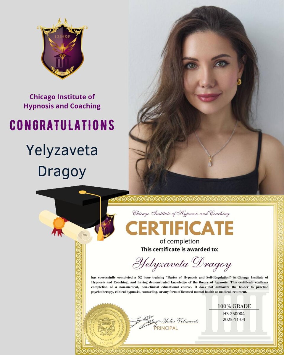 🥰 П О З Д Р А В Л Я Е М Елизавету с успешной сертификацией на курсе "Основы Гипноза и Саморегуляции"🔥 🏆 Поздравляем от всей команды Chicago Institute of Hypnosis & Coaching ! ❤️ Пусть каждый ваш шаг будет осознанным, а каждый результат — вдохновляющим✨ Спасибо Вам за доверие и возможность сопровождать Вас на этом пути! 🥰