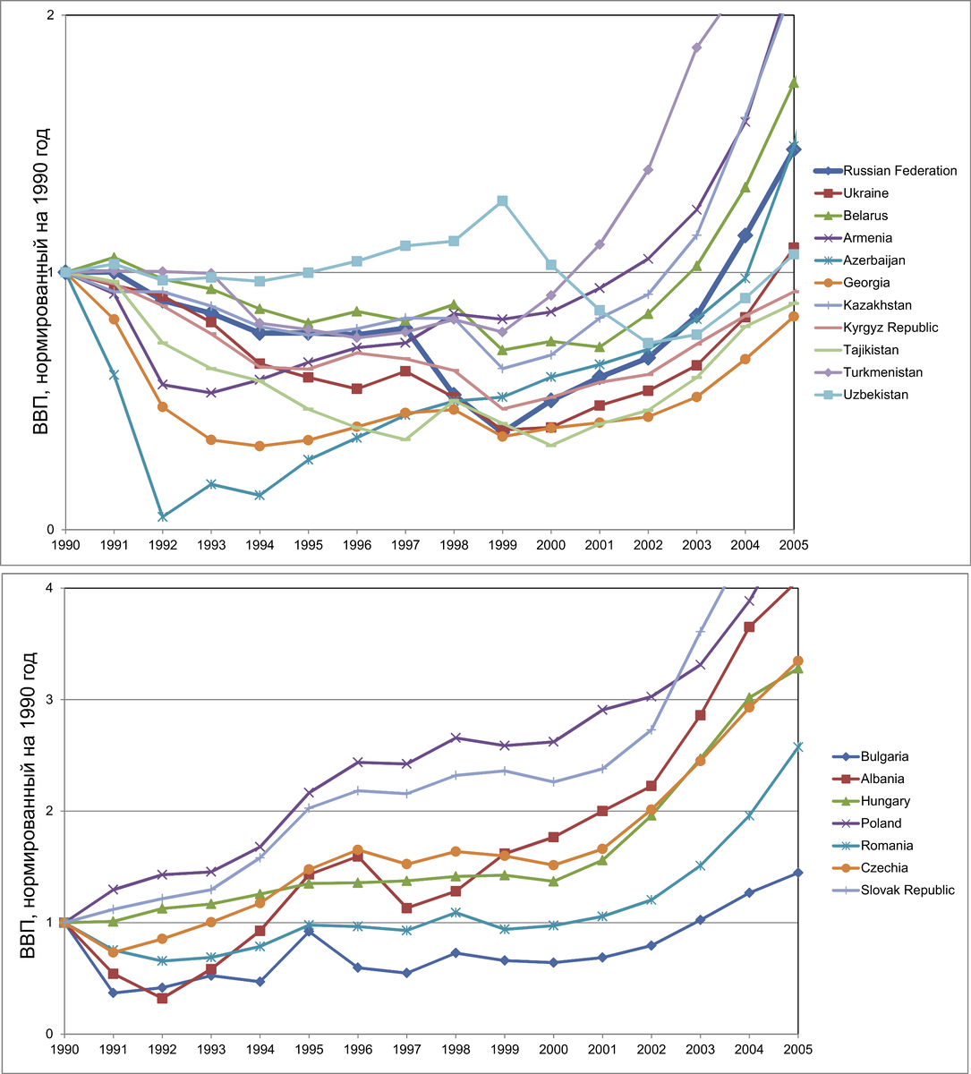Сейчас с одним человеком обсуждали развитие стран после социализма. Дело в том, что развитие стран в Западной Европе и бывших республик СССР немного отличается. Чтоб сравнить объективно, я взял данные с всемирного банка. Оттуда скачал их в csv формате, выбрал страны и 1990 год взял за единицу. В противном случае, у нас одни страны были бы в районе нуля, другие улетели бы ввысь. Наверху республики бСССР, снизу Европа. Как видно, у всех стран бСССР кроме Узбекистана провал. Притом долгий провал. Залечен между 2000 и 2005 годами. Притом Россия тут не выпадает, выделил жирным. Да, страны Прибалтики отсутствуют, у них нет данных на 1990 год. Не знаю почему. В Европе ситуация иная. Польша и Словакия растут быстро без провала. Пришлось даже задрать график до 4. Венгрия (Hungary) растёт стабильно, хоть и медленно. Чехия упала немного, но к 1993 году выровнялась. У Болгарии спад самый критичный, выкарабкались лишь в 2003. У Румынии небольшой спад, вышла на прежний уровень 1995, но потом долго н