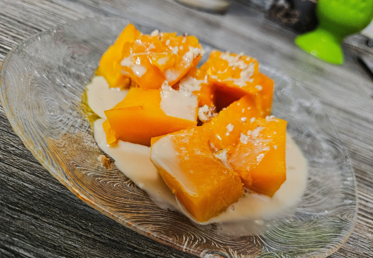 Очень вкусный десерт из тыквы ("кабак татлысы"). Такое блюдо часто подавали еще со времен османской империи во дворцах султанов. Ингредиенты для десерта: - тыква 1.5 кг; - 2 ст. сахарного песка; - 2 ст. (2/3 наполненности) стакана воды холодной; - долька лимона; - ванильный сахар пакетик; - гвоздика 10 шт. Для сервировки десерта: - тахин (кунжутная паста, не сладкая); - грецкие орехи. Пошаговая инструкция: 1) Возьмем тыкву, очистим от кожуры и порежем на кусочки среднего размера . Выкладываем в миску для духовки или на противень. 2)Польем соком лимона . 3)Посыпаем сахарным песком. 4) Добавляем ванильный сахар для аромата . 5) Закрываем целофаном и убираем на 2 часа в холодильник. 6) После расстойки сахар должен частично раствориться . 7)Добавляем гвоздику. 8)Заливаем на 1/2 часть водой кусочки тыквы. 9) Накрываем фольгой и ставим в духовку на час при нагреве 200 градусов . 10) После духовки тыква должна быть сочная и мягкая. 11) Приступим к сервировке. Измельчаем грецкий оре