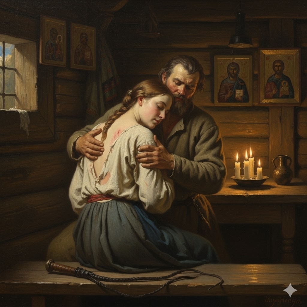 Будучи поклонником эстетики Домостроя, сгенерировал несколько картинок, сфокусировавшись на том его моменте, где говорится, что "должен муж жену свою наказывать, вразумлять ее страхом наедине, а наказав, простить и попенять, и нежно наставить, и поучить, но при том ни мужу на жену не обижаться, ни жене на мужа – жить всегда в любви и в согласии." с упором на вторую часть предложения, то есть попробовал запечатлеть момент взаимного прощения супругов после наказания/поучения. Надо сказать, что в нынешнее время подобный тип отношений, хоть и не столь распространен, но тоже имеет место по моим наблюдениям, причем по взаимному согласию обоих партнеров. Просто потому, что у определенных людей (в основном, женщин) есть внутренняя склонность быть в подчиненном состоянии. Некоторые даже ведут блоги по теме и с гордостью пишут, как их воспитывает их доминантный партнер, с демонстрацией фотоотчетов следов наставления. И как могу заметить браки, где это практикуется, как правило, более крепкие, че