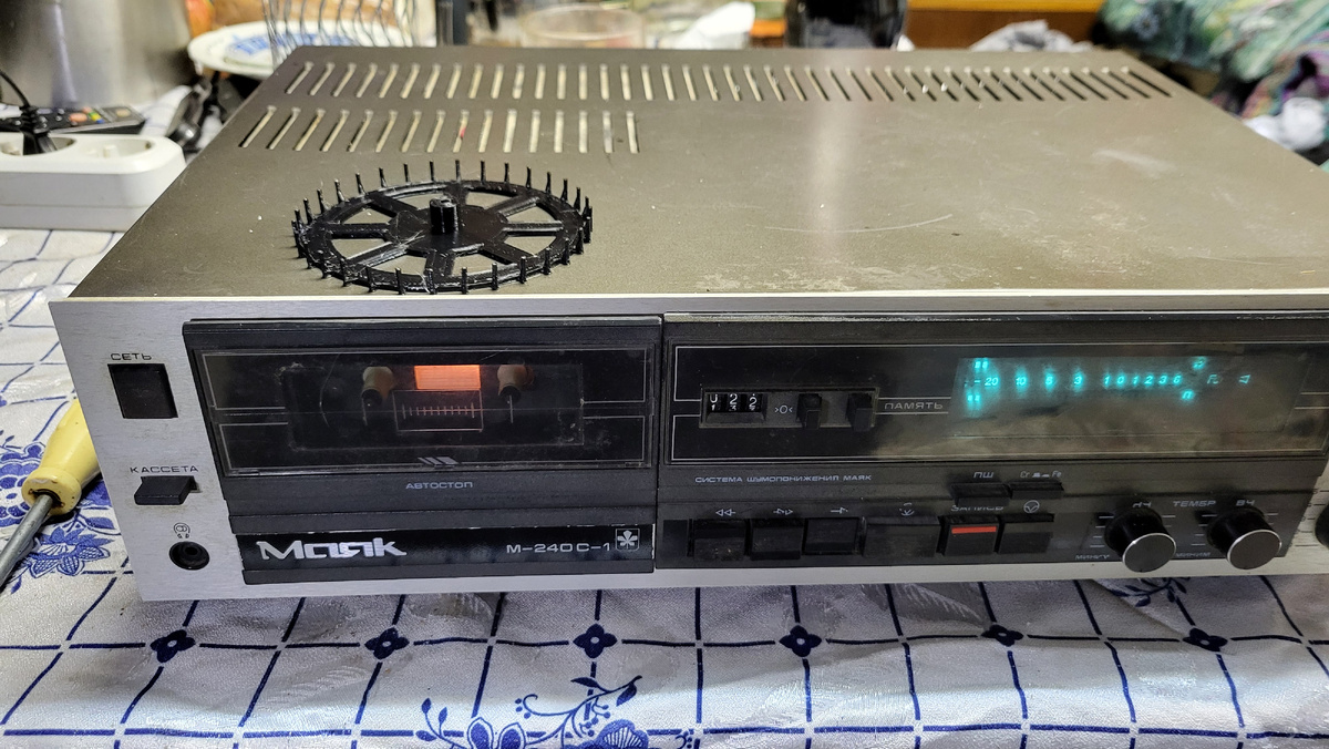 Было решено записать на другом магнитофоне частоту 440Гц и по ней уже настроить Sound. На каком магнитофоне писать? Их у меня хватает. Было решено записать на Маяк 240с-1, там большой и тяжёлый маховик тонвала и ещё родной пассик. Я был уверен, что именно на нём идеальная скорость. Сделал запись частоты 440Гц, установил в Sound и настроил скорость по отсутствию биений.