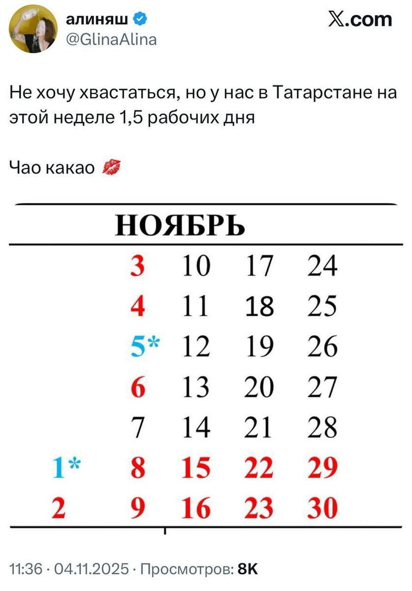 📍 Татары изобрели гениально простое решение: когда нужно отметить Конституцию (6 ноября) и сэкономить энергию перед выходными (4 ноября — День народного единства), они отхватили 5 ноября с условием сокращённого дня. Полтора рабочих дня в сухом остатке. Результат: четыре дня выходных подряд (2, 3, 4, 6 ноября). День Конституции от 1992 года, сумел разбить неделю ровно пополам. Логика календаря: если не можешь победить выходные — присоединяйся к ним. И республика присоединилась.