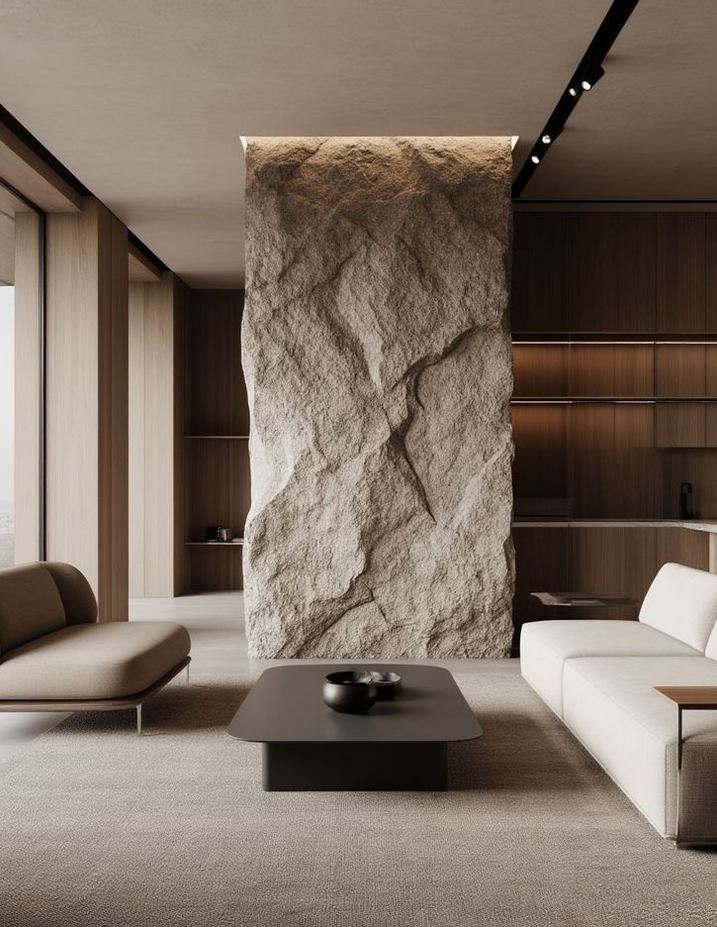 С камнем категорически нельзя совмещать пластиковые панели, синтетические ткани и другие подобные материалы. Это как минимум будет смотреться странно. Используете камень — сделайте его соседями натуральные материалы (хороший текстиль, дерево, стекло, металл).