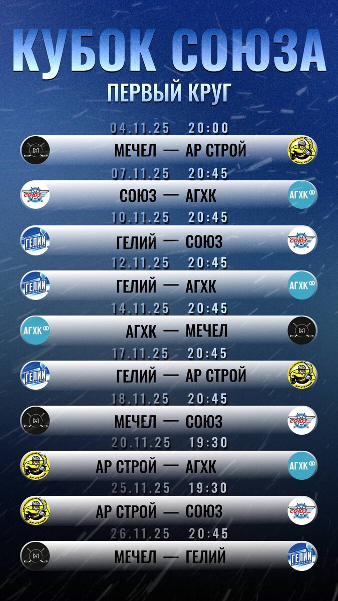 Вчера в Свободном стартовал хоккейный турнир 4 ноября в Свободном в спорт комплексе «Союз» начался первый круг хоккейного турнира «КУБОК СОЮЗА», в котором примут участие пять команд: ХК «Мечел» ХК «Союз» ХК «АР СТРОЙ» «АГХК» ХК «Гелий» Сохраняйте расписание состязаний и приходите поболеть за своих фаворитов.
