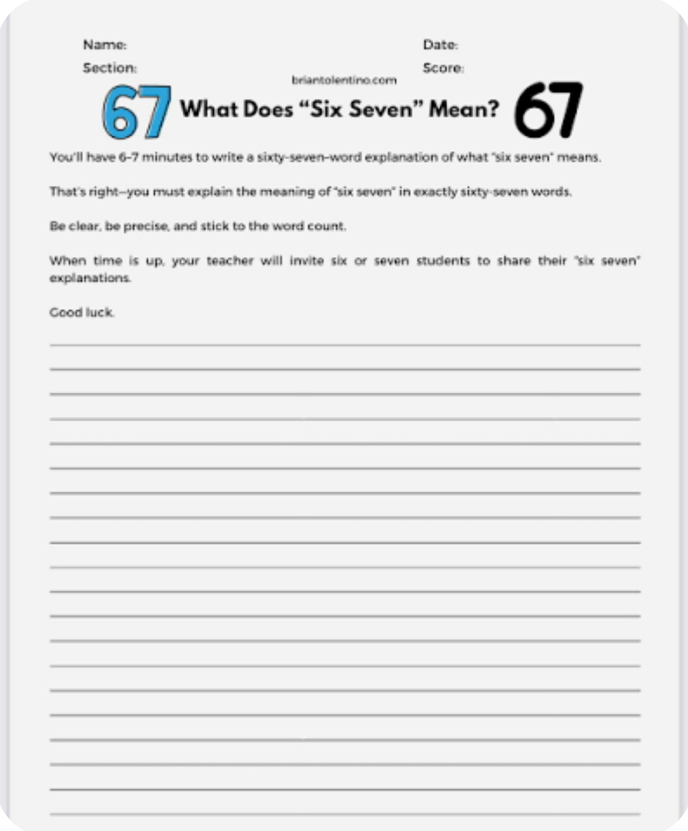 Учитель в видео рассказала, как она поиздевалась в ответ: в летучке по математике все ответы были «67, 6/7, 6.7» и вариации на эту тему. В общем, когда Джесси посреди урока внезапно взревел «six-seeeeeven!» - а Джесси регулярно выдает внезапное и не имеющее связи с реальностью - я была готова.