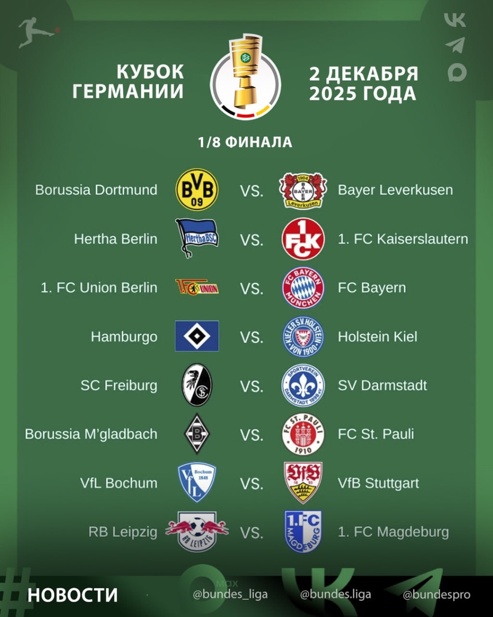 Кубок Германии 2025/26 🏆 Расписание матчей 1/8 финaла ✔️ 2 декабря 2025, 16:00 Боруссия Д - Байер 04 Бохум - Штутгарт Гамбург - Хольштайн Боруссия М - Санкт-Паули РБ Лейпциг - Магдебург Унион - Бавария Фрайбург - Дармштадт 🏁 Финал Кубка Германии по футболу сезона 2025/2026 состоится 23 мая 2026 года на Олимпийском стадионе в Берлине. ⭐️ MAX /// Видео+ ❤ Телеграм /// Аналитика+ ✅️ Флагманская /// Новости+