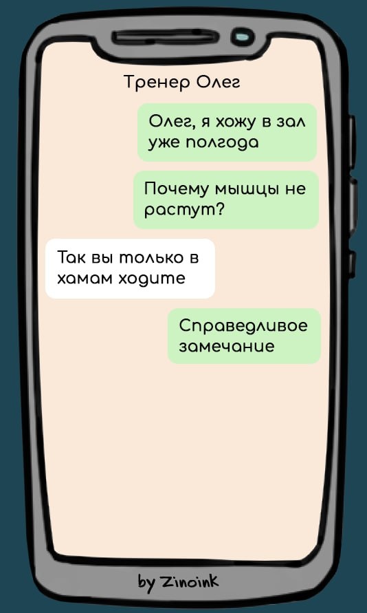 Недавно я снова пошел заниматься в спорт-зал. И я правда все еще в восторге от своего тренера! Ведь это единственный человек, который искренне верит, что вы способны сделать 20 берпи после 8 часов в офисе. Он с легкостью отличает «не могу» от «не хочу», как сомелье отличает бургундское от бордо. И да, он действительно видит сквозь стены – особенно через дверцу холодильника в час ночи. В общем, сегодняшнюю статью я посвящаю им – фитнес-тренерам! Я собрал 10 смешных переписок с гуру спорта. Уверен, они тебе понравятся! Ставь лайк, подписывайся и не забывай, что еще больше классных шуток без рекламы и цензуры ждут тебя с подпиской премиум! Иногда представление о зале кардинально отличается от реальности. Вы усердно ходите на тренировки несколько раз в неделю, а результата ноль. Казалось бы, парадокс! Но оказывается, есть тонкие грани в слове – попотеть на фитнесе). Многие уверены, что для мощного роста мышц не хватает дорогого протеина или волшебных аминокислот... А тренер, как настоящий