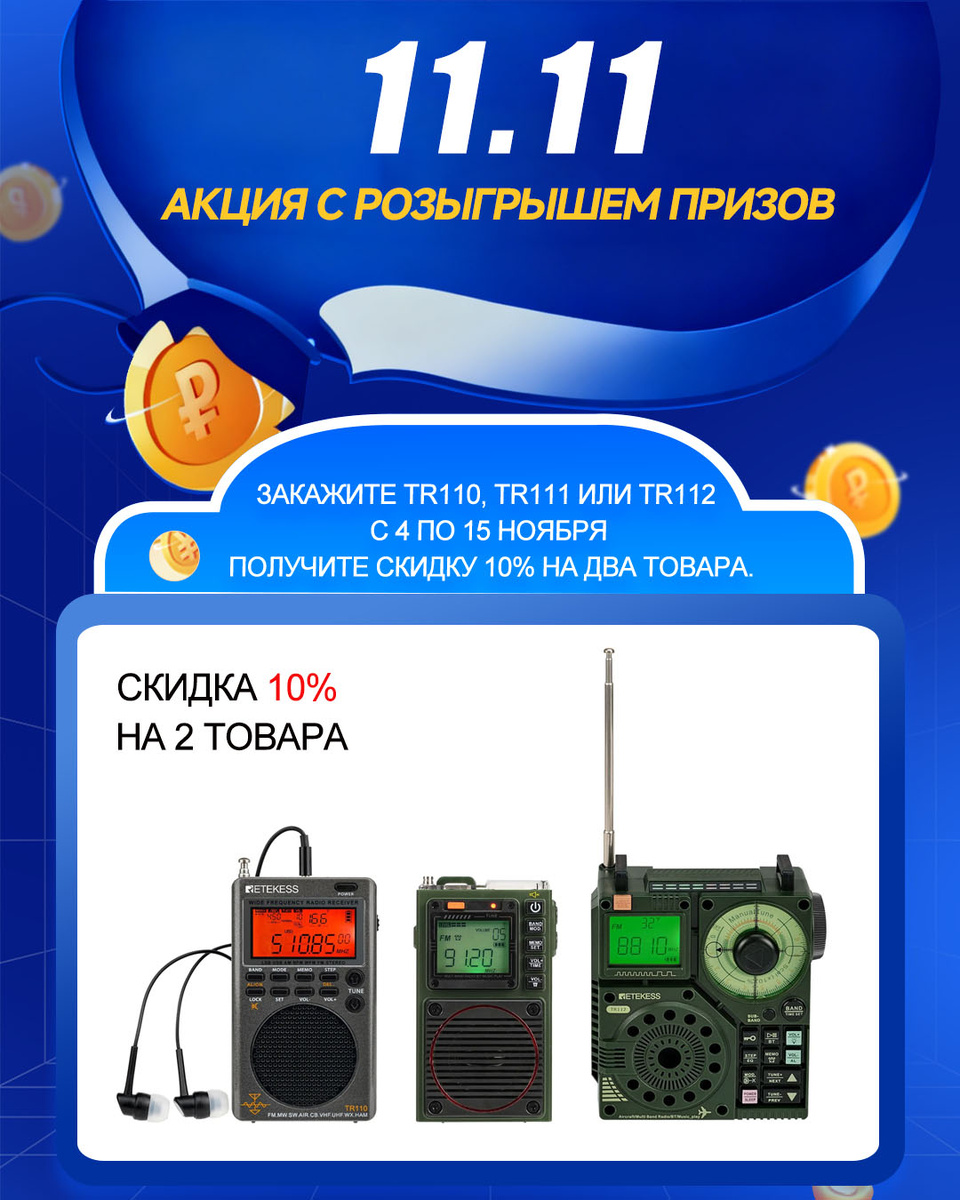 При покупке двух товаров TR110, TR111 или TR112 в указанном магазине с 4 по 15 ноября вы получите дополнительную скидку 10%. Ограничено 20 заказами, действует порядок обслуживания.