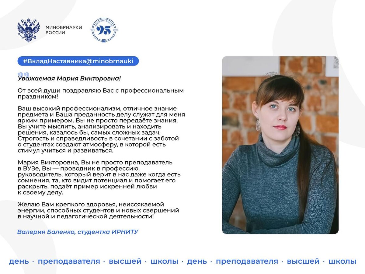 Ко Дню преподавателя высшей школы Минобрнауки запустило онлайн-акцию «Вклад наставника» ✨ День преподавателя высшей школы — профессиональный праздник тех, кто делится знаниями, зажигает искру любознательности и ведет за собой целые поколения ученых, инженеров, специалистов. В преддверии этого дня студенты Иркутского политеха рассказали о своих наставниках. Тех, кто становится настоящим проводником в мир науки и знаний! Самые теплые и искренние истории смотрите в карточках ➡️ Присоединяйтесь к нашей акции! Расскажите и вы о своем любимом преподавателе Иркутского политеха в комментариях к этому посту. #ВкладНаставника@minobrnauki