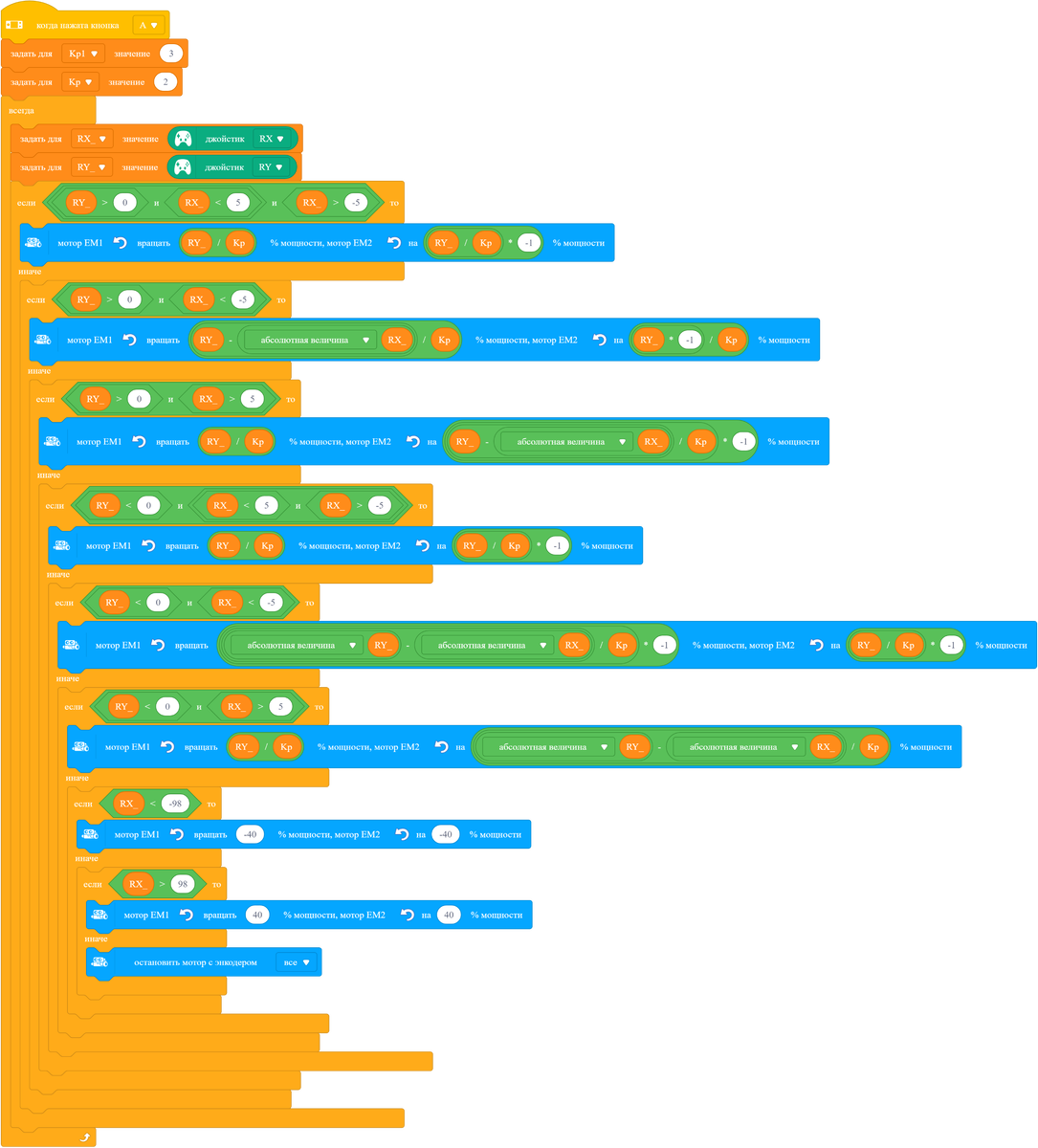 Продолжим рассматривать возможности беспроводного пульта управления от компании MakeBlock. Ранее мы уже говорили о том, что данный пульт обеспечивает огромное количество возможностей управления, и активно используется на соревнованиях роботов. Сегодня будем пробовать программу управления движением робота с помощью джойстика на пульте. Напомним про суперфункцию - наличие 8-гранного бортика, ограничивающего движение каждого из двух джойстиков. Угол прямо: значение, снимаемое с оси Х = 0, а значение, снимаемое с оси Y = 100. И мы можем при таких значениях дать Роботу команду ехать прямо. Далее оператор может перемещать джойстик по граням бортика, обеспечивая точные значения для управляющих сигналов. Пример - джойстик влево: Х < 0, а Y < 100. Мы можем создать формулу для управляющего воздействия, обеспечивающую точное соответствие углов поворота и наклонов джойстика направлению движения и скорости робота. Подробно все это изложено в нашей книге "Секреты спортивной робототехники с mBot2 и