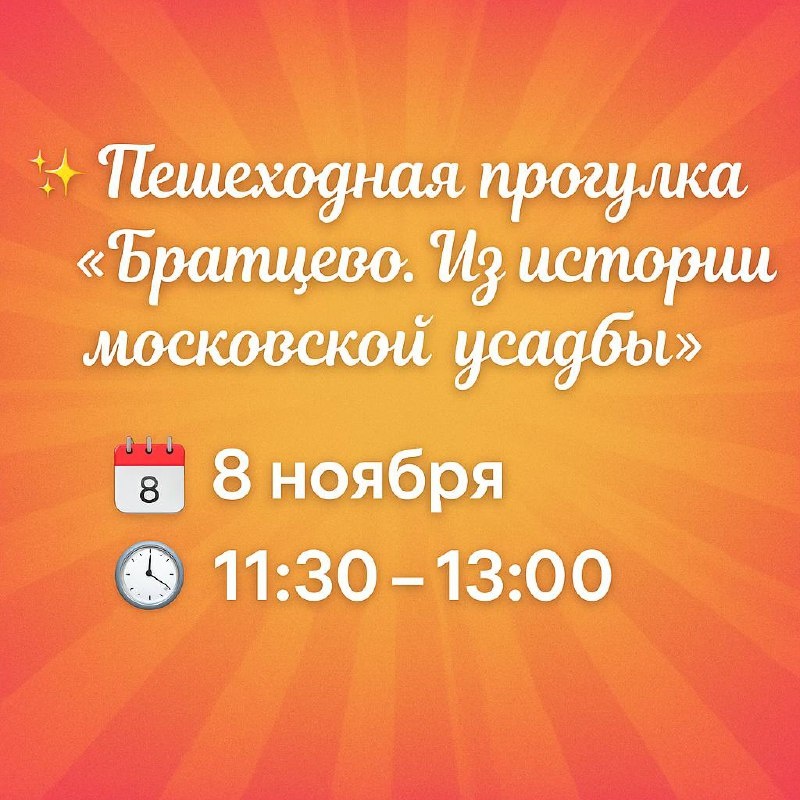 📅 ПЕШЕХОДНАЯ ПРОГУЛКА «БРАТЦЕВО». ИЗ ИСТОРИИ МОСКОВСКОЙ УСАДЬБЫ 16+ 👣 Организатор: библиотека №229 СЗАО Москвы 🗓 Дата: 8 ноября 🕰 Время: 11:30–13:00 📍 Место встречи: холл библиотеки №229, ул. Туристская, д. 31, к. 1 🌿 Приглашаем всех желающих на прогулку по усадебному комплексу в историческом районе Братцево. Во время экскурсии вы: — узнаете историю усадьбы с XVII века до наших дней; — услышите рассказ о любви графини Е. П. Строгановой-Трубецкой и фаворита Екатерины II И. Н. Римского-Корсакова; — прогуляетесь по парку, увидите главный дом, ротонду «Миловида» и другие постройки. 🏛 Братцево — объект культурного наследия России, связанный с именами Зубовых, Хитрово, Нарышкиных, Строгановых, Апраксиных и Щербатовых. 📞 Телефон для справок: +7 (499) 493-53-29 🔗 Регистрация: timepad.ru/event/3639169 #Москва #Братцево #экскурсия #пешаяпрогулка #усадьбыМосквы #библиотека229 #СЗАО #окцсзао 📱 Подписывайся на наш канал, чтобы не пропустить интересные мероприятия и мастер-классы в С